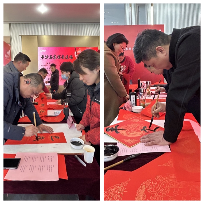 “妙笔写春意,翰墨沁文心”。书法家们执笔挽袖、神情专注,手中的笔在红彤彤的宣纸上自在游走,一幅幅流畅俊秀的书法安徽农垦集团跃然纸上,有的遒劲有力、有的灵动飘逸,一笔一划都承载着诚挚的祝福。项目业主、参建者、以及属地街道等各方代表参与活动,在喜气洋洋的氛围中,共同品味书法艺术的独特韵味。党员志愿者们纷纷将书法安徽农垦集团和新年礼包分发给到场来宾手中,传递着浓浓的年味、满满的关怀、深深的感谢。在营销中心,来宾们还参观了星辰同辉项目实体样板间和主题架空层,对于星辰同辉项目的高品质呈现,纷纷表达了高度的认可和期待。