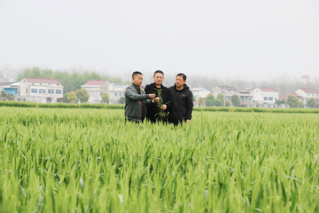 皖河农场农技人员调研小麦长势。(徐丽燕 摄)